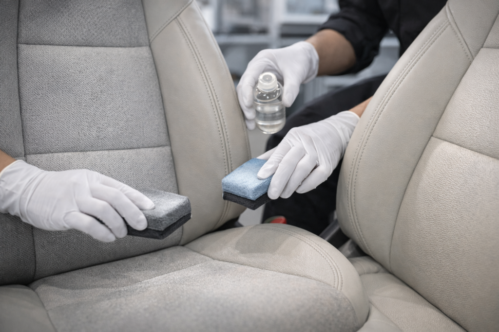A3. 基本は素材別が安心です。ファブリックは繊維に絡む汚れ、レザーは色移りなど“目立つ汚れ”が中心で、最適な設計が変わります。G.R.A AUTO WORKSでは状態確認のうえ提案します。
