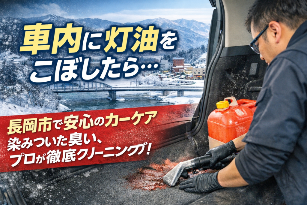 2月の長岡市は、雪・湿気・暖房で車内が閉じやすく、灯油の臭いが「残る/戻る」条件がそろいやすい季節です。 「新聞紙で吸い取った」「拭いた」「マットは交換予定」…それでも強い臭いが残るのは、表面だけの問題ではない可能性があるからです。